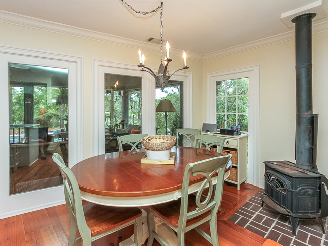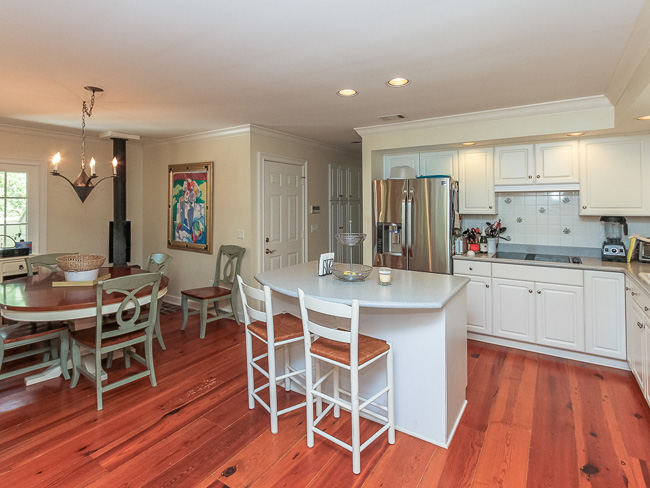 and vaulted ceiling, heart pine floors, stainless kitchen, screen