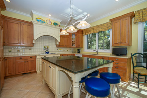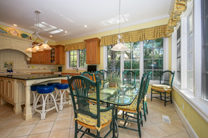 wet bar and high wood paneled ceilings, spacious eat-in kitchen