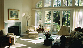 room with fireplace and high ceilings and lovely golf views.