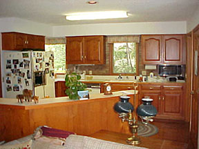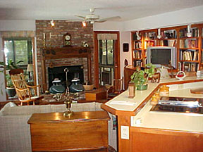 a cozy kitchen/family room with brick fireplace and beautiful old heart-of-pine